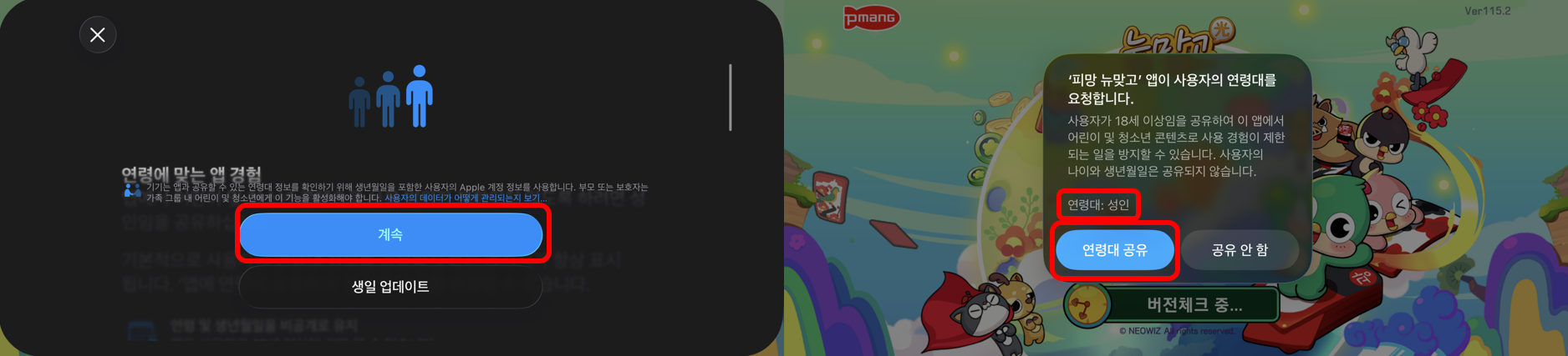 5. 다시 노출되는 연령 확인 팝업에서 반드시 [연령대 공유] 버튼을 선택해 주세요.