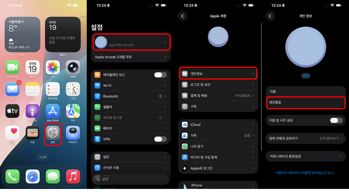 1. iPhone/iPad의 [설정] 앱 실행 후,최상단의 [Apple ID (사용자 이름)]를 선택 후,[생년월일]메뉴로 진입해 주세요.